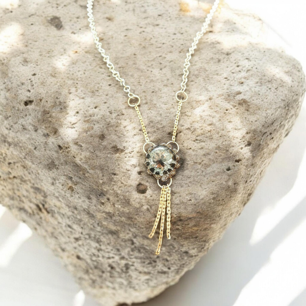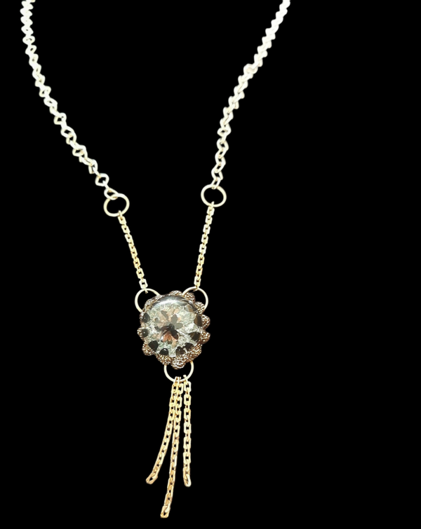 Cabochon en verre de Murano serti au fil crocheté, chaine plaqué or